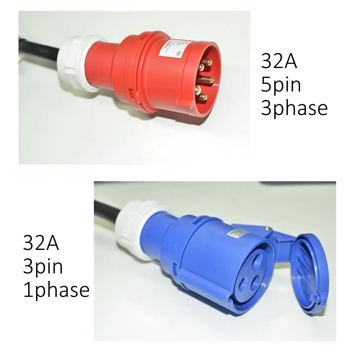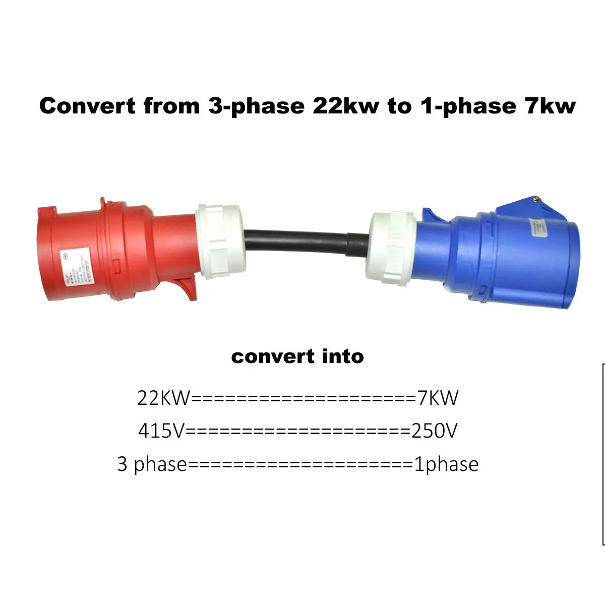 Adaptateur de charge de véhicule électrique 22kW, prise 3 phases rouge mâle 32A vers connecteur de prise 32A femelle bleu monophasé 7kW pour le chargement EV