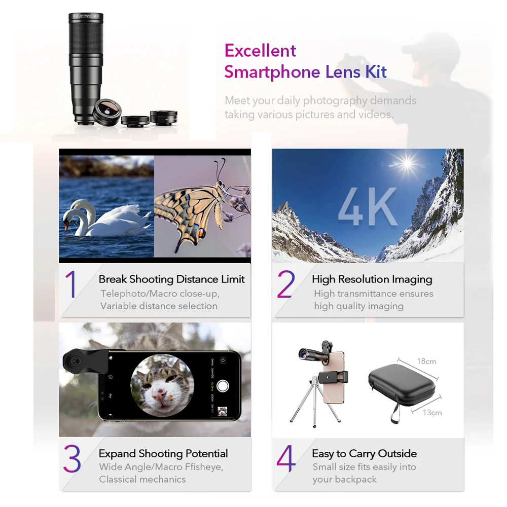 Il s'agit d'un nouvel objectif zoom optique 22X de haute qualité avec mini trépied, répondant à vos différents besoins photographiques.