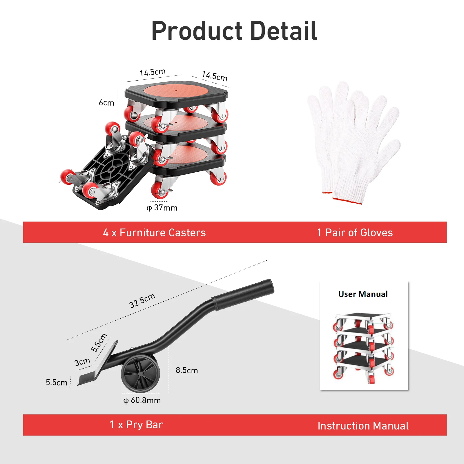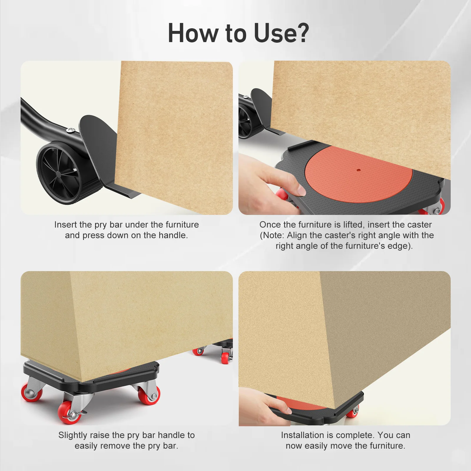 Utilisez simplement la barre de levier ergonomique pour soulever les meubles, positionnez les roulettes solidement sous les pieds ou les bords, retirez le levier et faites glisser en douceur vos meubles sur diverses surfaces.