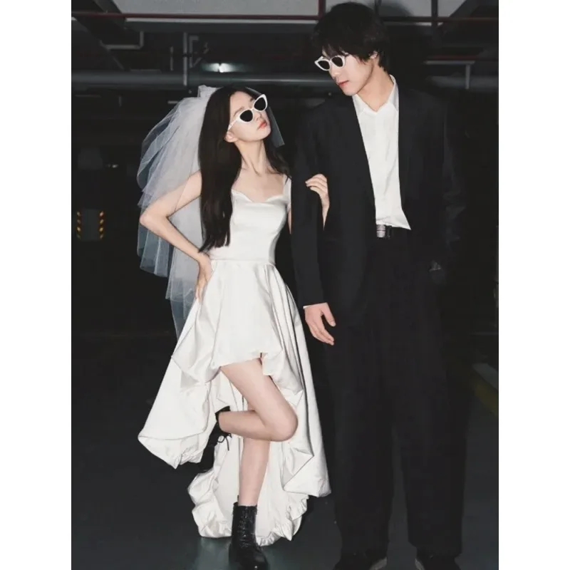 L'ourlet asymétrique avec un devant court et un dos long ajoute une touche moderne à la robe de mariée traditionnelle.