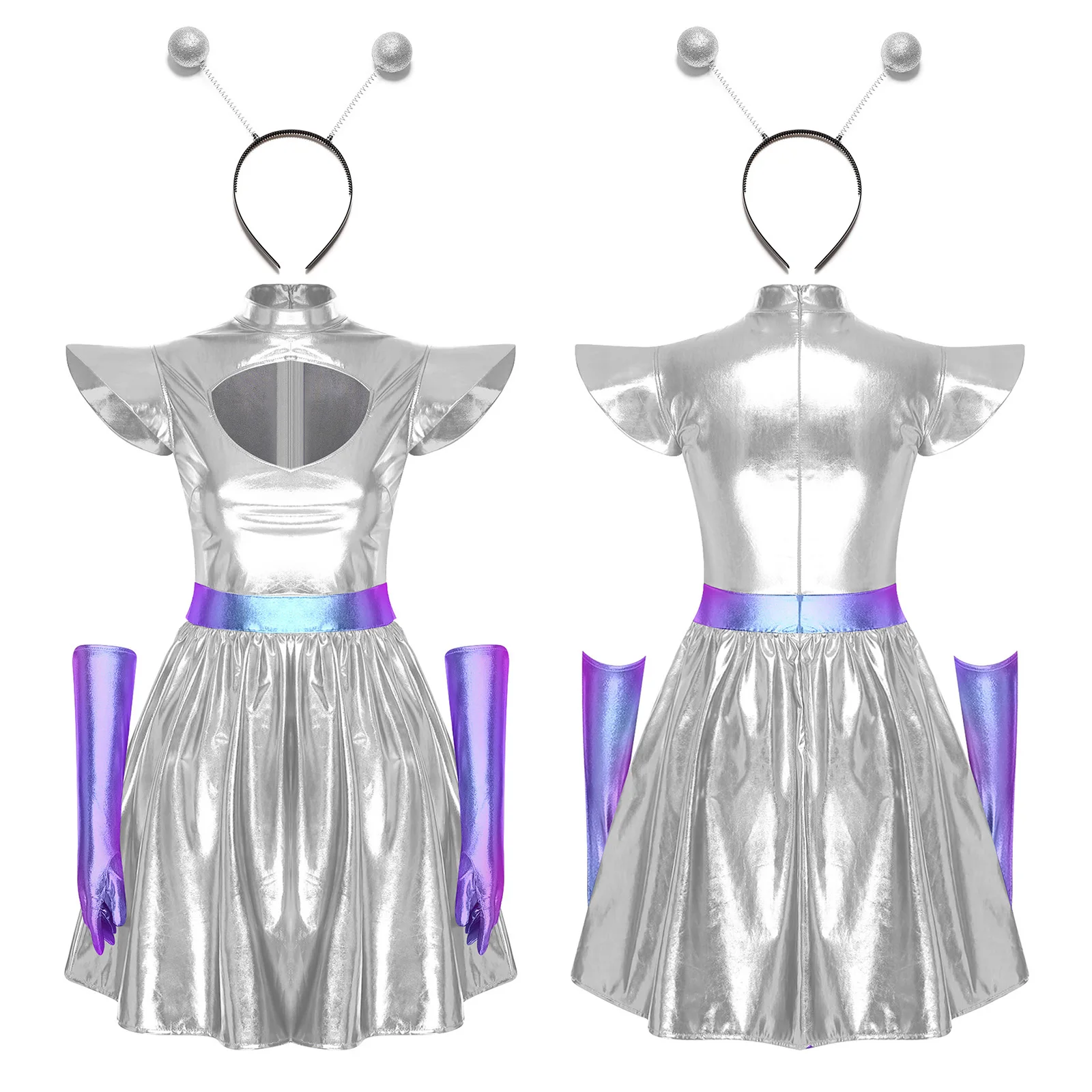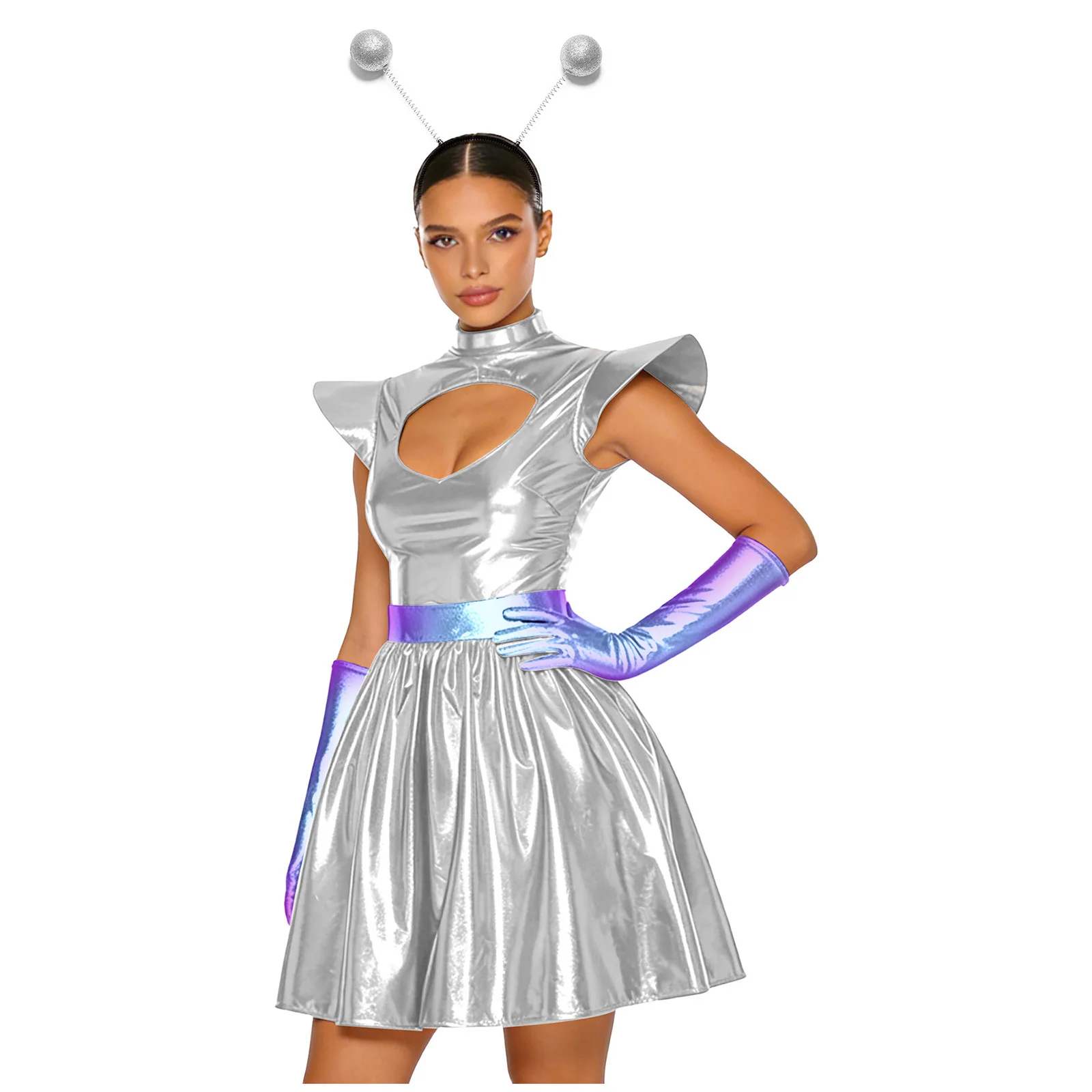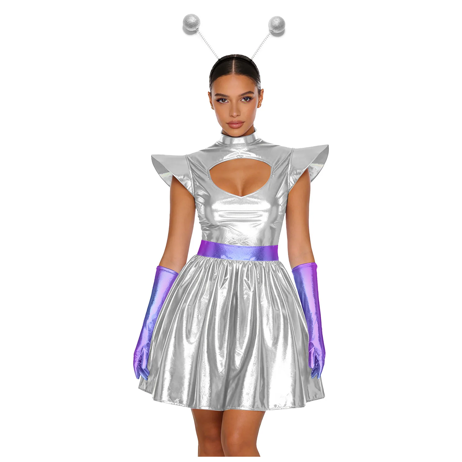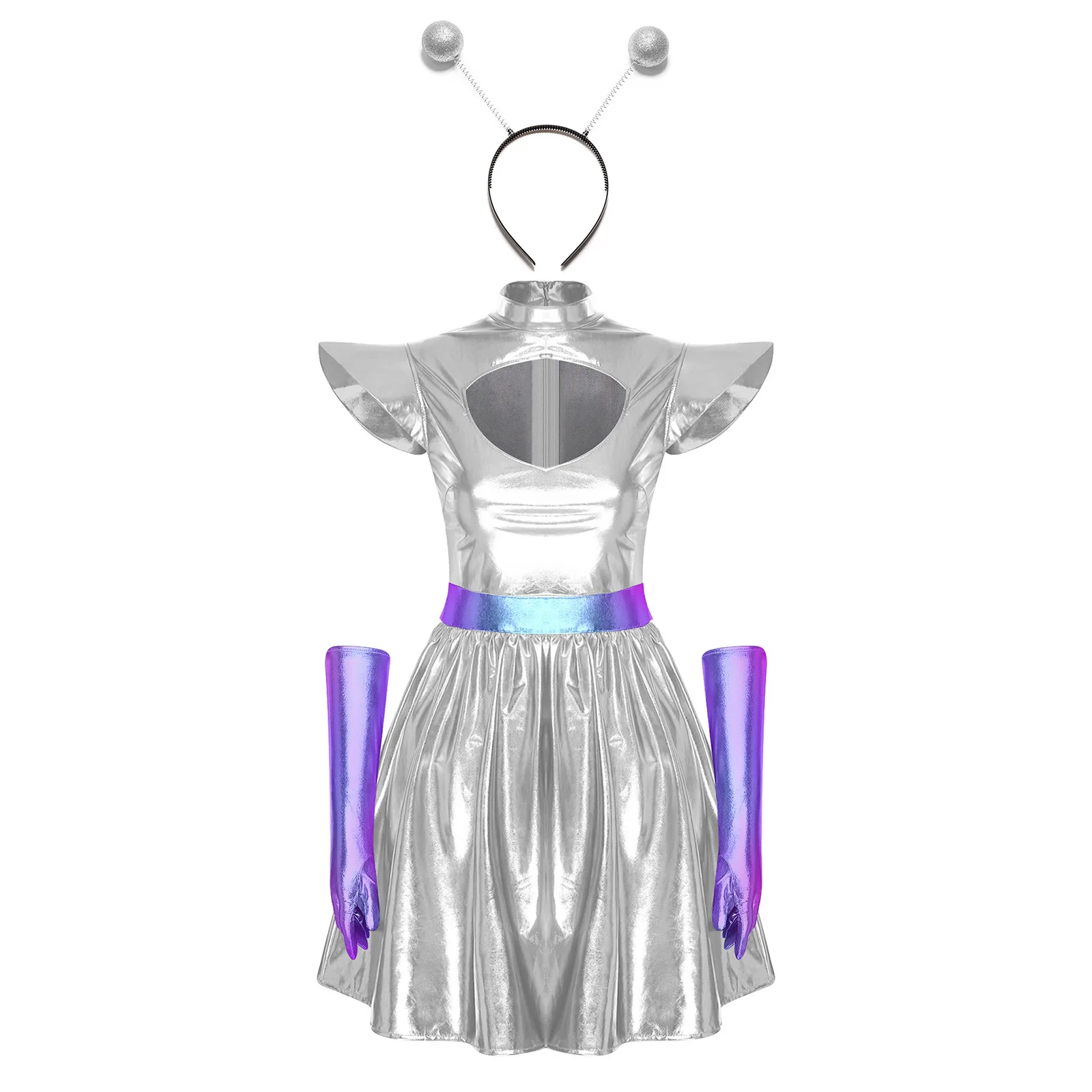 Il s'agit d'un ensemble de cosplay d'astronaute extraterrestre, livré avec des gants et une boucle pour cheveux, offrant une expérience de déguisement complète et immersive.