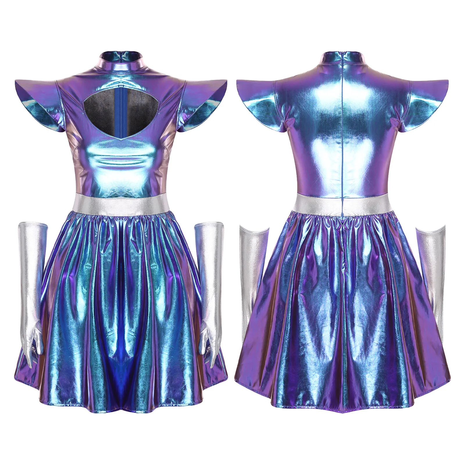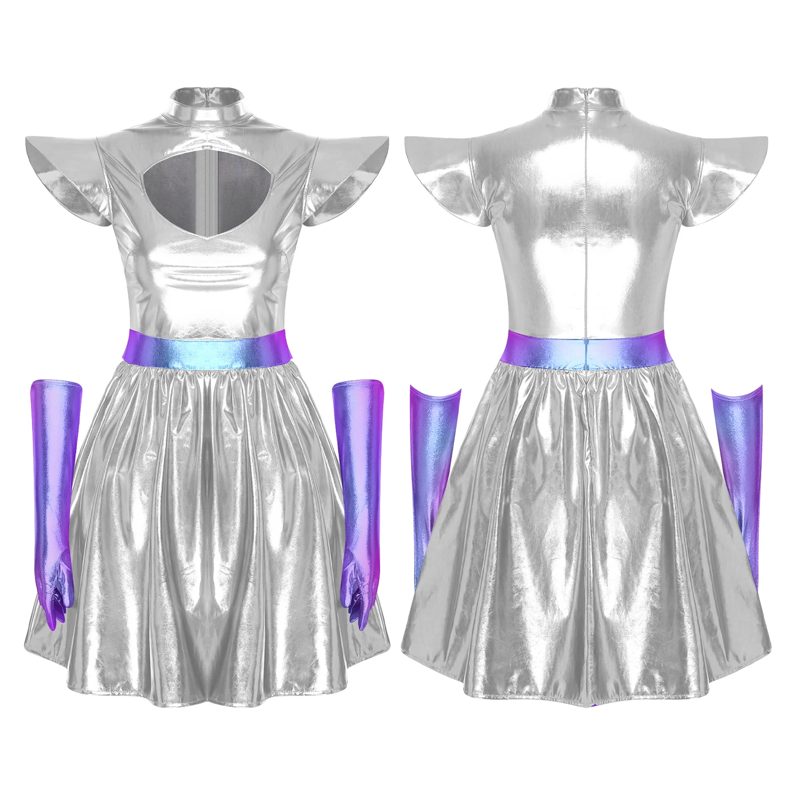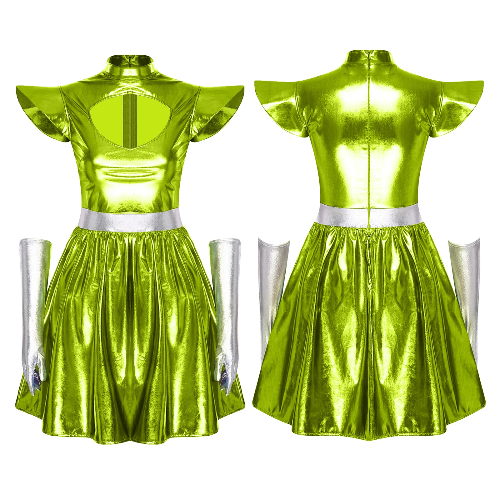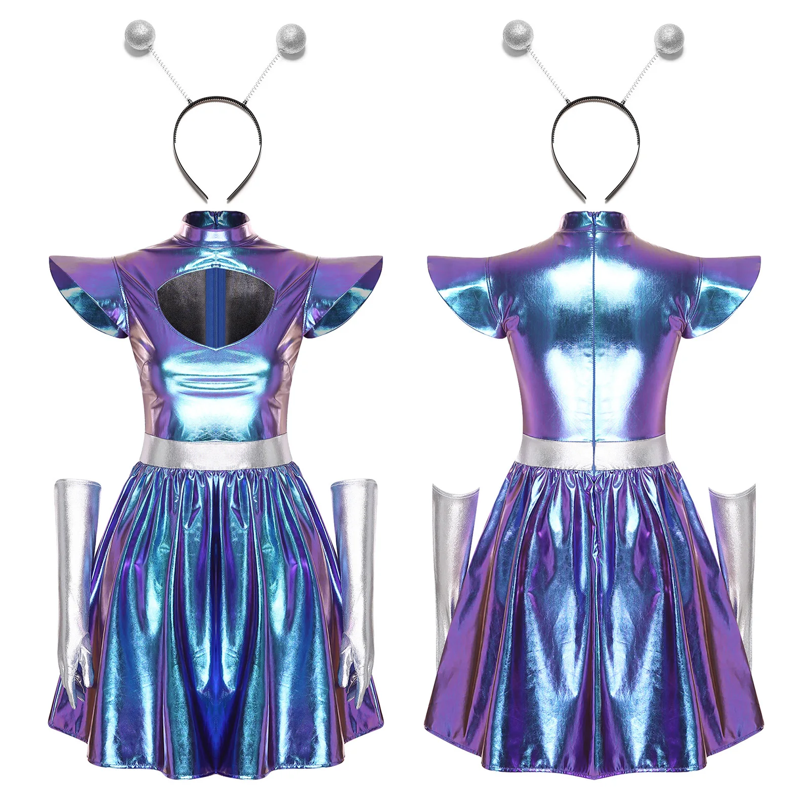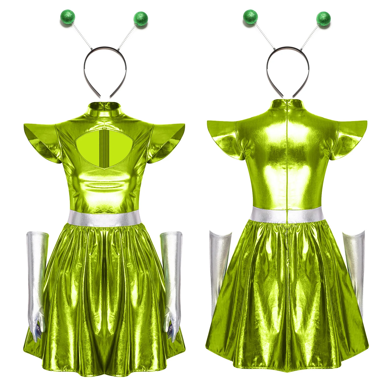 Il s'agit d'un ensemble de cosplay d'astronaute extraterrestre, livré avec des gants et une boucle pour cheveux, offrant une expérience de déguisement complète et immersive.