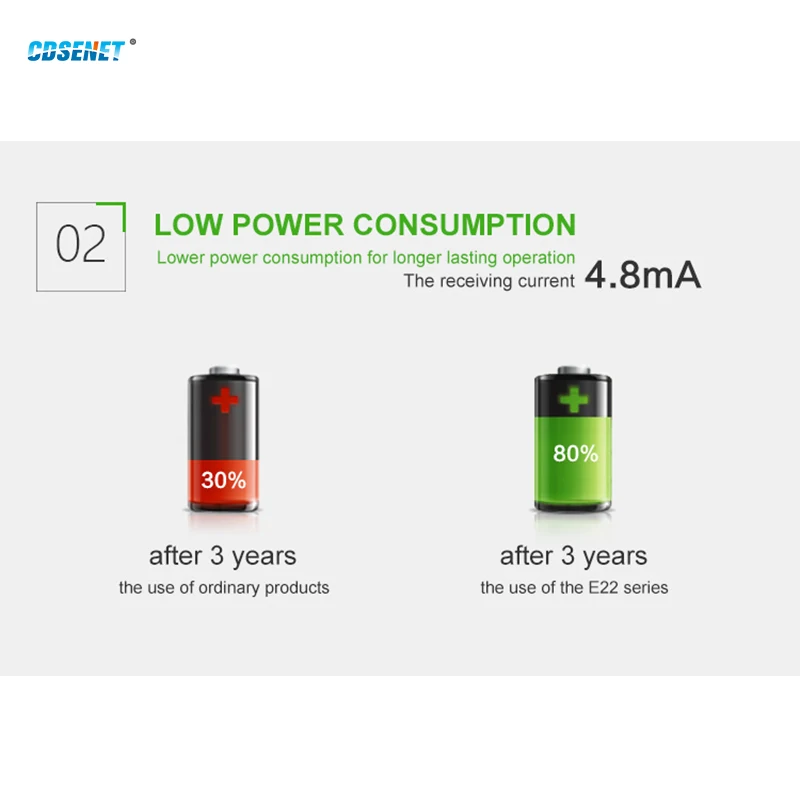 Émetteur-récepteur sans fil LoRa SX1262 850MHz-930MHz CDSENET E22-900M22S 915MHz SMD TCXO émetteur récepteur Module rf Télécharger des fichiers : DEMO : https://www.cdebyte.com/pdf-down.aspx?id=928 PCB : https://www.cdebyte.com/pdf-down.aspx?id=929 Manuel d'utilisation : https://www.cdebyte.com/pdf-down.aspx?id=1822 Paramètre RF Valeur Remarque Fréquence de travail 850 ~ 930 MHz Puissance de transmission 22 dBm Max.Puissance (160 mW) Sensibilité de réception -147 dBm Taux de données aériennes 0,018k ~ 300kbps Distance de test 7000 m En plein air et clair, avec puissance maximale, gain d'antenne 5dBi, hauteur de 2m Paramètre matériel Valeur Remarque Taille 14*20mm Type d'antenne IPEX / Trou pour tampon Interface de communication SPI Paquet CMS Paramètre électronique Min. Typ. Max. Unité État Alimentation 1.8 3.3 3.7 Niveau de communication 1.8 3.3 3.7 Courant de transmission 22 dBm (160 mW) Réception du courant 4.8 5.0 5.9 Courant de sommeil Température de fonctionnement -40 +85 Humidité de fonctionnement Température de stockage -40 +125 Modèle Interface Fréquence Puissance Distance Air Paquet Taille Caractéristique dBm Taux (bps) (mm) E22-400T30DC UART SX1262 433M 470M 0,3 ~ 62,5 K DIP 24*43 Technologie de modulation LoRa nouvelle génération E22-400T22DC UART SX1262 433M 470M 5.5 0,3 ~ 62,5 K DIP 21*36 Technologie de modulation LoRa nouvelle génération E22-400T30S1C UART SX1262 433M 470M 0,3 ~ 62,5 K CMS 25*40.5 Technologie à spectre étalé LoRa E22-900T22S1C UART SX1262 868M 915M 0,3 ~ 62,5 K CMS 16*26 Relais automatique LoRa E22-400T22S1C UART SX1262 433M 470M 5.5 0,3 ~ 62,5 K CMS 16*26 Relais automatique LoRa E22-900T22D UART SX1262 868M 915M 0,3 ~ 62,5 K DIP 21*36 Une nouvelle génération de technologie à spectre étalé LoRa E22-400T30D UART SX1268 433M 470M 0,3 ~ 62,5 K DIP 24*43 Nouveau LoRa Spread Spectrum, relais automatique, configuration sans fil E22-400T22D UART SX1268 433M 470M 0,3 ~ 62,5 K DIP 21*36 Nouvelle génération de technologie à spectre étalé LoRa E22-900T30S1B SX1262 UART 868M 915M 0,3 ~ 62,5 K CMS 40.5*25 Faible consommation, anti-interférence E22-400T30S1B SX1268 UART 433M 470M 0,3 ~ 62,5 K CMS 40.5*25 Faible consommation, anti-interférence E22-230T30S SX1262 UART 230M 0,3 ~ 15,6 k CMS 40.5*25 Faible consommation, anti-interférence E22-230T22S SX1262 UART 230M 0,3 000 ~ 62,5 CMS 16*26 Faible consommation, anti-interférence E22-900T22S1B SX1262 UART 868M 915M 0,3 ~ 62,5 K CMS 16*26 Faible consommation, anti-interférence E22-400T22S1B SX1268 UART 433M 470M 0,3 ~ 62,5 K CMS 16*26 Faible consommation, anti-interférence E22-400M30S SX1268 SPI 433M 470M 0,018 ~ 300 000 CMS 24*38.5 Faible consommation, anti-interférence E22-900M30S SX1262 SPI 868M 915M 0,018 ~ 300 000 CMS 24*38.5 Faible consommation, anti-interférence E22-900M22S SX1262 SPI 868M 915M 0,018 ~ 300 000 CMS 14*20 Faible consommation, anti-interférence E22-400M22S SX1268 SPI 433M 470M 0,018 ~ 300 000 CMS 14*20 Faible consommation, anti-interférence