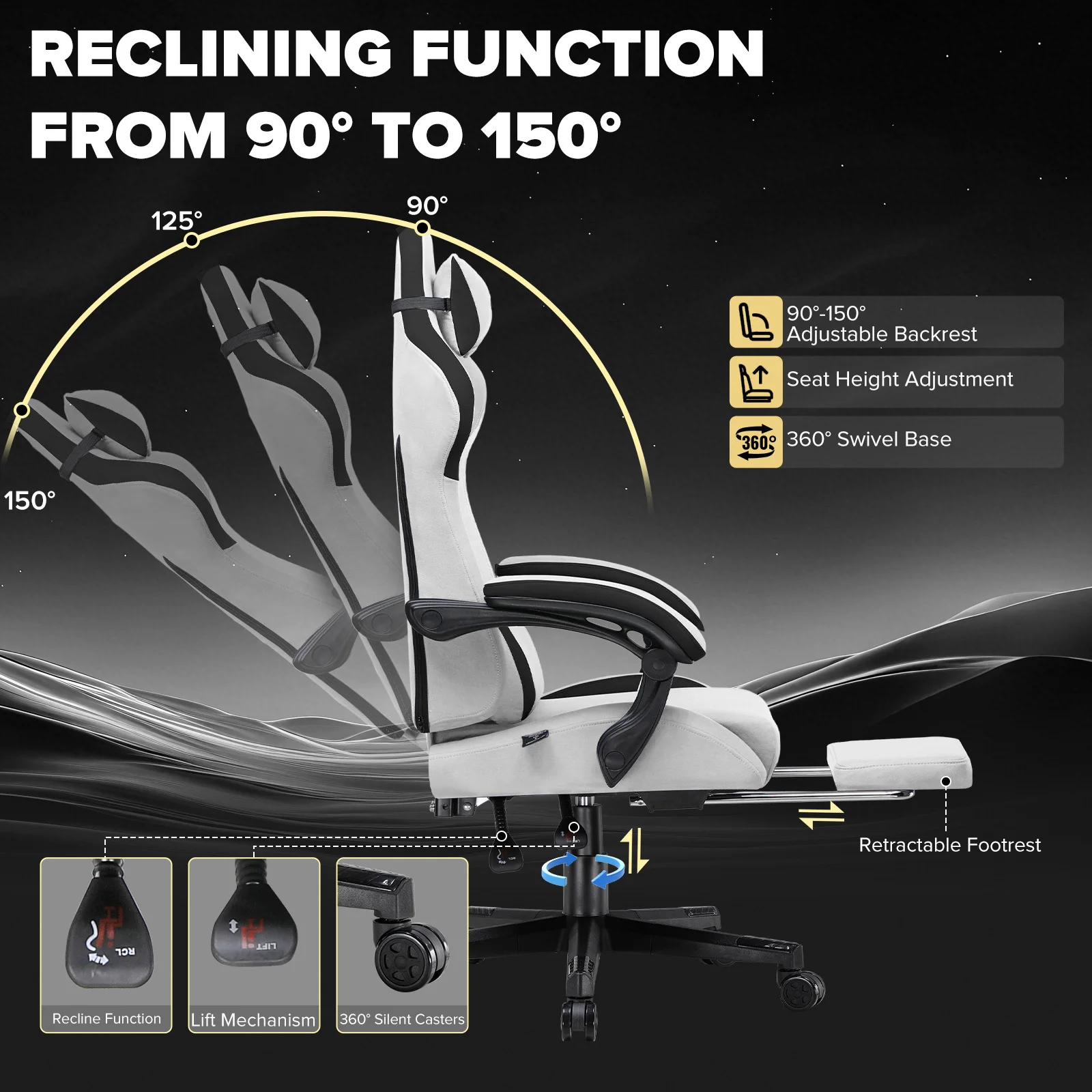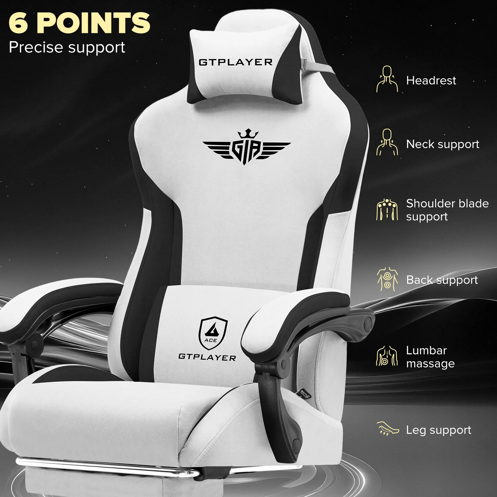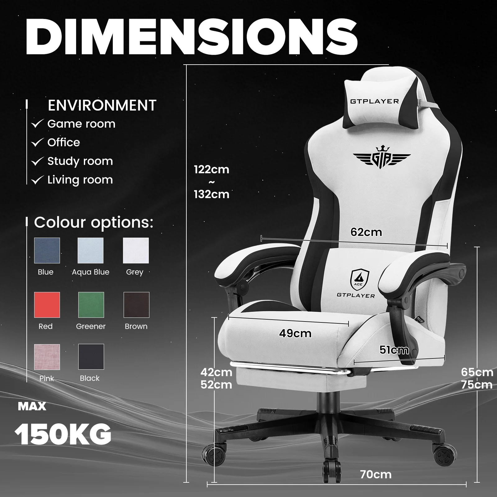 GTPLAYER Chaise de jeu ergonomique en tissu/lin/faux cuir Support lombaire Chaise de joueur Chaise PC avec dossier élargi Housse en tissu respirant -Frais et confortable avec de longues périodes de jeu : Contrairement au cuir artificiel, la housse en tissu de haute qualité assure une meilleure circulation de l'air.Même après des heures assises, vous restez agréablement frais, parfait pour les nuits d'été pleines d'action de jeu. Conception ergonomique pour les joueurs -Support là où vous en avez besoin Cette chaise de jeu est spécialement conçue pour les longues sessions de jeu.Le dossier ergonomique s'adapte à votre colonne vertébrale, l'oreiller lombaire et l'appui-tête offrent un soutien optimal pour les matchs d'e-sports intensifs ou des heures de streaming.Le cadre en acier et les matériaux de haute qualité garantissent une stabilité jusqu'à 150 kg. 165° Dossier réglable -Parfait pour se détendre entre les allumettes : d'un seul mouvement, vous pouvez incliner la chaise jusqu'à 165°-Idéal pour les pauses courtes ou les siestes puissantes entre les tours de jeu.Le réglage du dossier assure des positions d'assise flexibles, que ce soit pour jouer, travailler ou se détendre. Repose-pieds extensible -Plus de confort pour votre base de jeu Le repose-pieds intégré est facile à retirer et transforme votre chaise en une surface de couchage confortable.Idéal pour des moments de détente après un jeu classé rigoureux ou pour diffuser en mode refroidissement.L'accoudoir de connexion est parfait pour jouer et travailler de bureau. Stable et élégant -Le choix parfait pour votre configuration de jeu avec un cadre en acier robuste, des rouleaux silencieux et un design moderne, cette chaise s'intègre dans n'importe quelle salle de joueur. La palette de couleurs classique avec des accents noirs souligne votre configuration professionnelle, que ce soit pour les jeux sur PC, la console ou le bureau à domicile.