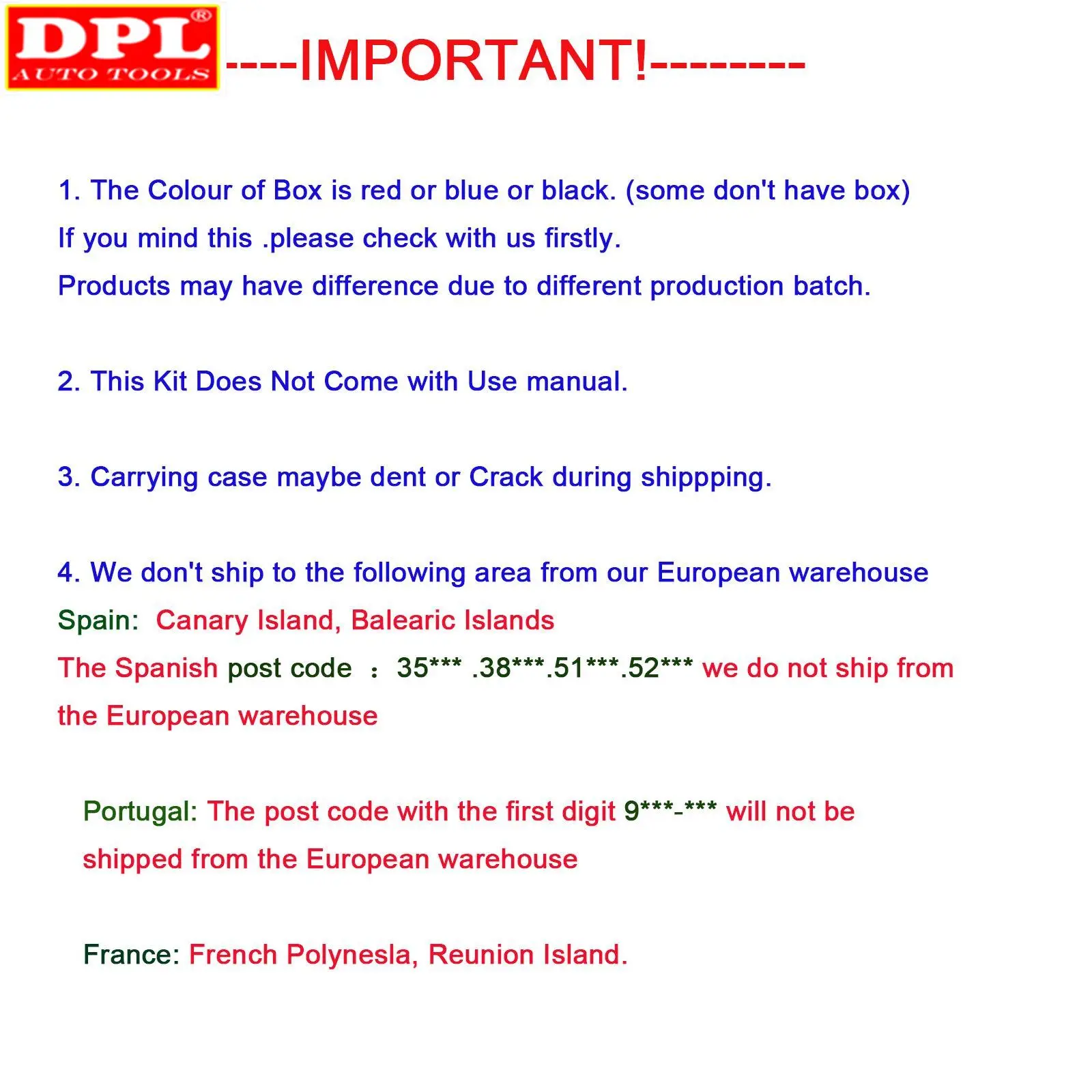 Spécification: Nom du produit: outil de synchronisation de moteur Couleur: Chrome Matériau: acier au Chrome vanadium avec surface de placage Taille: 75.2x11.4mm / 70.3x7.8mm / 70.3x5mm Montage (juste pour référence): Pour citroen:Berlingo I/II (05-11), Berlingo III (08-12), C1 (05-10), C2 (03-10), c3 I/II (02-10), C3 III (10-12), C3 Picasso (09-12), C3 Pluriel (04-10), DS3 (09-12), C4 (04-11), C4 II (11-12), C4 Picasso/Grand Picasso (06-12), C5 II (04-08), C5 III (07-12), DS4 (11-12), Nemo (08-10), Xsara II (04-08) & Xsara Picasso (04-10) Pour peugeot:107 (05-10), 1007 (05-10), 206 (01-12), 206CC (05-07), 207 (06-12), 207CC (07-12), 307 (01-08), 308 (07-12), 308CC (09-12), 3008 (09-12), 407 (04-11), 508 (11-12), 5008 (09-12), Bipper (08-10), partenaire I/II (05-11) & Partner III (08-12) Pour Ford pour C-MAX (07-12), pour Fiesta (02-11), pour Focus (04-12), pour Focus pour C-MAX (03-07), pour Fusion (04-11) et pour Grand pour C-MAX (10-12) Pour Volvo C30 (06-12), S40 (04-10), S80 (09-12) et V50 (04-10) Pour Mazda-2 (02-10), 3 (04-12) et 5 (10-12) Pour Suzuki pour Liana (04-08) et SX4 (07-11) Pour Toyota pour Aygo (05-10) Le forfait comprend: 4x outil de synchronisation moteur Frais de douane: Dans la plupart des cas, l'acheteur n'a pas besoin de payer de douane. Nous le déclarerons comme un échantillon et une faible valeur pour éviter la taxe. Mais parfois, dans certains pays, l'agent des douanes peut être strict. Nous ne sommes pas responsables des frais de douane, s'il vous plat Consultez la politique douanière de votre propre lieu, comme l'italie et la hollande. Si vous devez payer les frais de douane, C'est votre devoir envers votre propre pays, l'acheteur doit comprendre cette situation.