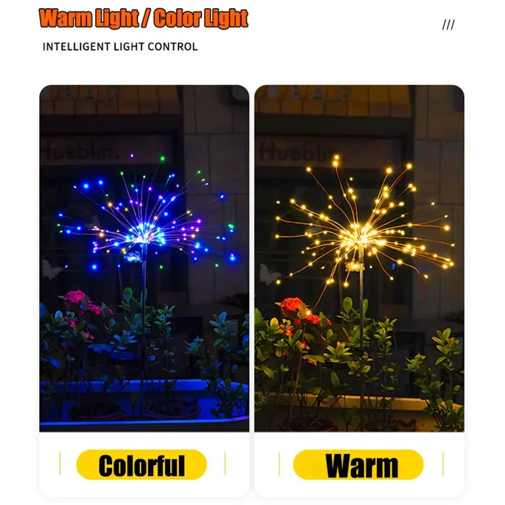 Ce feu d'artifice peut résister à des conditions météorologiques extrêmes et antirouille, vous pouvez les utiliser partout o vous le souhaitez; Configuration sans fil et capteur de lumière intégré, allumez l'interrupteur, ces lampes solaires s'allumeront automatiquement dans l'obscurité et s'éteindront automatiquement pendant la journée!