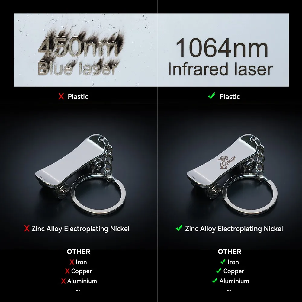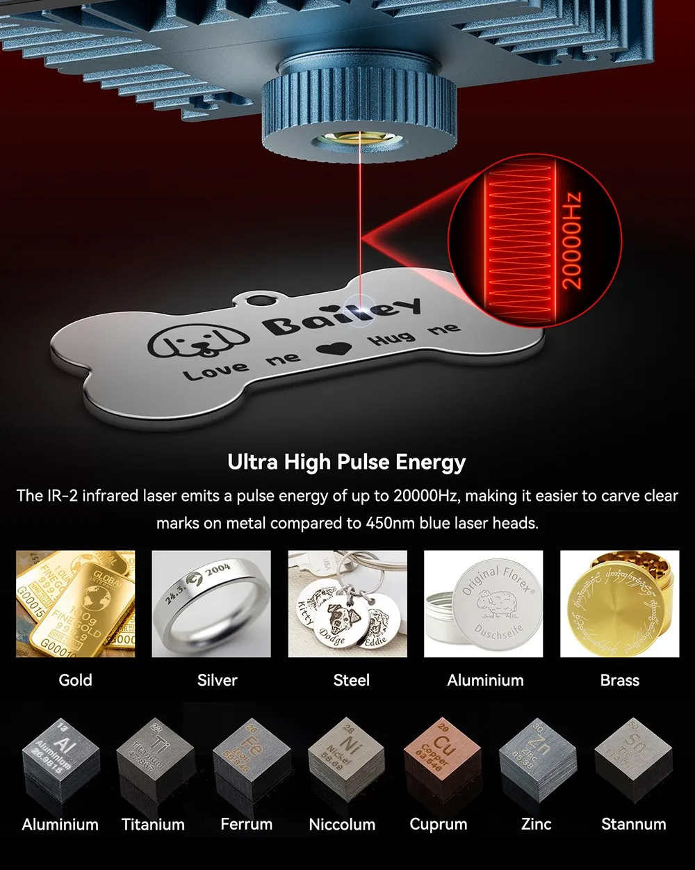 Le module laser infrarouge 1064 nm convient à la gravure sur une grande variété de métaux, notamment l'or, l'argent, le platine, le cuivre, l'aluminium, le zinc, le fer, l'acier inoxydable, les oxydes et alliages métalliques, les plastiques et les acryliques foncés.