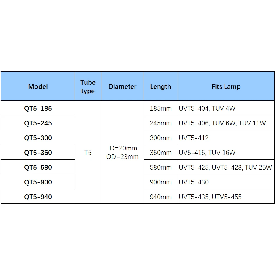 Pack de lampes UV de remplacement 55 W Il s'agit de lampes de remplacement pour filtre à eau ultraviolette et d'un manchon à quartz. Comprend 3 lampes UV 55 W.modèle : UVT5-455, Longueur : 910 mm, Diamètre : 15 mm 1 pièce-tube de quartz.modèles : QT5-940, Longueur : 940 mm, ID : 20 mm, OD : 23 mm Ce pack est adapté à des fins de remplacement de 2 à 3 ans.La lampe et le tube sont compatibles avec le modèle de désinfection Coronwater UV de, SEV-5925L, SEV-5925LFS, SDE-55, SDE-55-F, SSV-5925-2P, SSV-5925-3P, SSV-5925-4P, SBV-5925-2P, SBV-5925-3P, SBV-5925-4P. et tout autre objectif de remplacement de filtre ultraviolet de 55 W. Emballage et expédition 3x lampes UVT5-455, 1x tube de quartz QT5-940. Emballage et expédition par colis d'expédition standard international. Inventaire mondial des entrepôts : Lamp Pack dispose d'un stock régulier en Chine, en Arabie Saoudite, en Russie, en Australie, en Espagne, en France et en Pologne.Veuillez vérifier et choisir l'endroit approprié pour l'expédition sur la page produit. Remarque : Les lampes et les manchons en quartz seront bien emballés avant expédition. Cependant, ce sont des objets fragiles et ont toujours une petite possibilité de subir des dommages dus à une manipulation brutale lors du transport. Veuillez les vérifier dans un premier temps lorsque le colis est reçu. si un problème inattendu se produit, veuillez nous contacter immédiatement, nous organiserons le renvoi du remplacement.