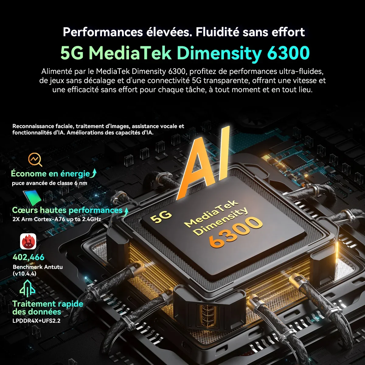 Processeur : 5G Media Tek 6300 Dimension ; Jusqu'à 2,4 GHZ