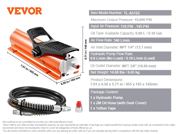 Pompe hydraulique à air de 10 000 PSI – Durable et puissante Obtenez une puissance fiable avec notre pompe hydraulique à air de 10 000 PSI.Construit résistant avec une coque dure, un long tuyau d'huile et rempli d'usine d'huile hydraulique (#13), il comporte des commandes faciles, une base résistante aux chocs et une configuration rapide.Prêt pour les travaux exigeants, il est efficace et construit pour durer. La coque extérieure robuste de la pompe à pied hydraulique protège les composants internes comme un champ.Il est résistant à la pression, à la corrosion et à la déformation dans des conditions difficiles.Rempli d'usine d'huile hydraulique (#13), il garantit un fonctionnement hydraulique efficace, sécurisé et durable. Le fonctionnement de cette pompe à pied de piste actionnée par air ne pourrait pas être plus simple.Deux commandes : « Pompe » pour démarrer et « Libérer » pour laisser le fluide refluer en douceur et avec précision : vous permettront de contrôler complètement votre système hydraulique avec un minimum d'effort. Avec deux trous de vis de fixation en bas, vous pouvez fixer cette pompe à pied hydraulique à air pour une utilisation stable et sans vibrations.Il s’agit de garder vos opérations stables et efficaces. Seulement trois étapes simples et vous êtes prêt!N'oubliez pas, ouvrez la bouche d'aération pendant 5 minutes avant de commencer, puis fermez-la pour que les choses fonctionnent correctement. Caractéristiques et détails 【10 000 PSI haute puissance】 : atteignez jusqu'à 10 000 PSI de pression hydraulique avec un flux d'air de 340 L/min.Cette pompe à air hydraulique offre des débits de 0,8 L/min (sans charge) et de 0,16 L/min (charge), ce qui la rend idéale pour les tâches lourdes telles que le levage, le pressage, le pliage, le redressage, la coupe, l'assemblage et le démontage. 【Rempli d'huile en usine】 : cette pompe hydraulique à air est livrée avec un grand réservoir de 0,69 L / 0,18 gallons rempli en usine d'huile hydraulique (#13) pour que vous puissiez commencer à travailler immédiatement.Cette fonctionnalité réduit le temps et les efforts de configuration.Il comprend une entrée d'air avec NPT 1/4 po et une sortie haute pression avec NPT 3/8 po. 【Long tuyau d'huile】 : cette pompe à pied de piste actionnée par air est équipée d'un tuyau en caoutchouc de 6,56 pieds/2 m renforcé avec trois couches de fil d'acier, capable de gérer des pressions allant jusqu'à 125 MPa.Cette conception empêche les fuites et permet un fonctionnement flexible sur de longues distances. 【Fonctionnement du pied sans effort】 : la pompe hydraulique à air à commande au pied comprend de l'huile hydraulique - aucun achat supplémentaire n'est nécessaire.Appuyez pour augmenter la pression et relâchez rapidement, rendant votre travail plus simple et efficace. Durable et résistant : fabriquée avec de l'aluminium de qualité aérospatiale et un botier de haute qualité, cette pompe hydraulique à air est conçue pour résister aux environnements industriels difficiles. La soupape de décharge interne assure une protection fiable des composants hydrauliques sous pression.