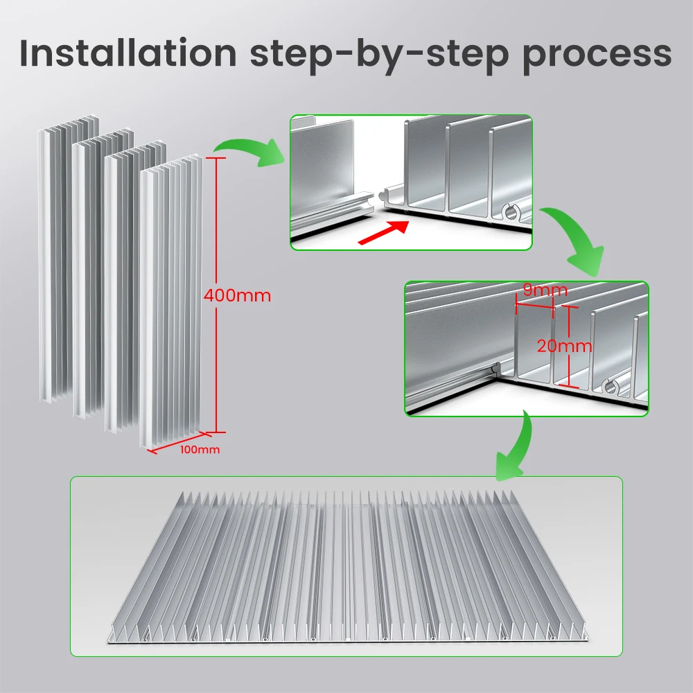 Chaque petit panneau en nid d'abeille mesure 400x100 mm, et quatre panneaux peuvent être combinés pour former un panneau en nid d'abeille complet de 400x400 mm.Cette conception modulaire vous permet de remplacer uniquement les pièces usées, ce qui vous permet d'économiser de l'argent à long terme.
