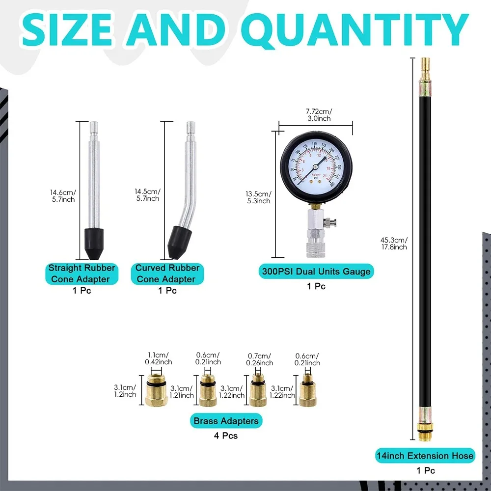 4.Kit de test de compression intégré : 1 jauge à ressort à encliqueter, 1 adaptateur d'extrémité conique droit en caoutchouc, 2 adaptateurs d'extrémité conique coudés en caoutchouc, 4 adaptateurs en laiton avec raccords métriques et joints toriques.m10, m12, m14, m18 ; 1x tuyau d'extension (longueur 35,5 cm)