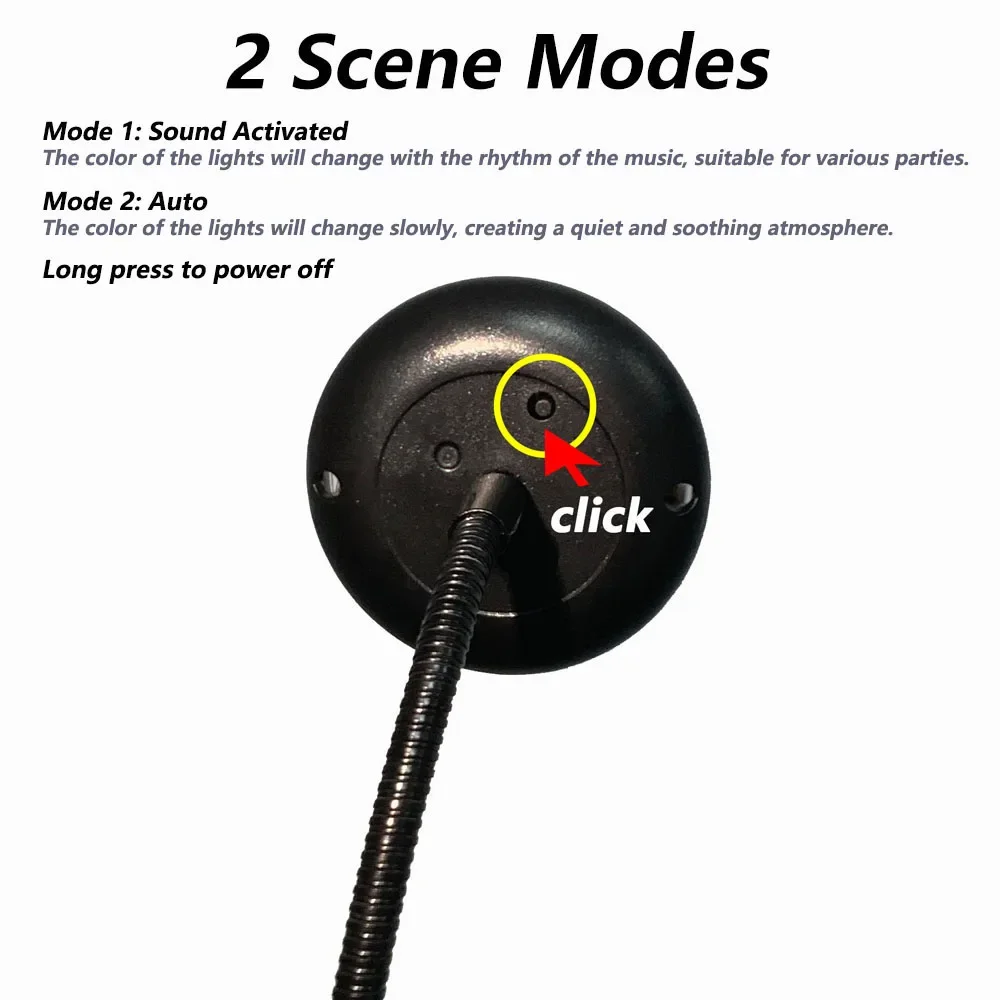 Mode 1: Sound Activated. The color of the lights will change with the rhythm of the music, suitable for various parties.