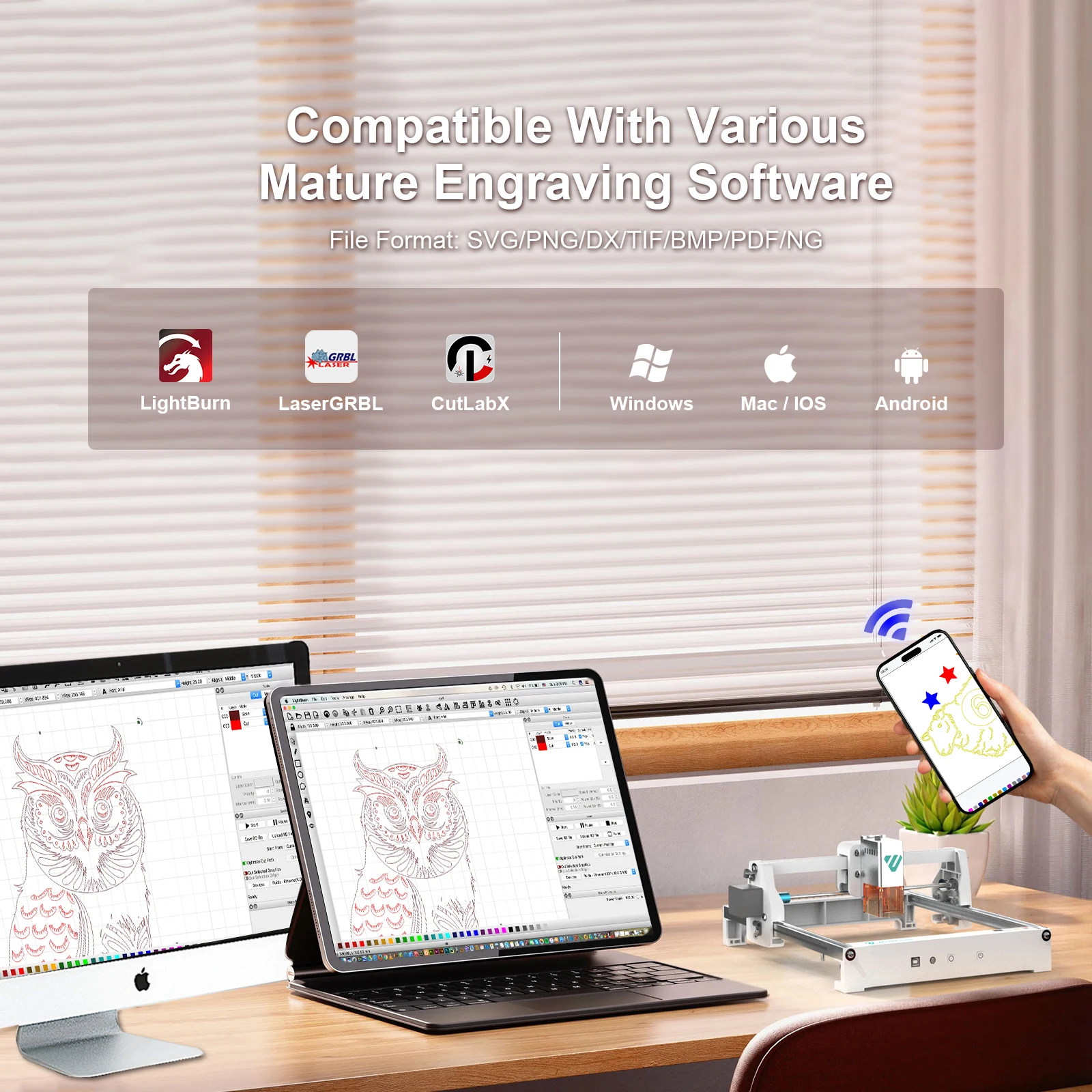 Profitez d'une flexibilité ultime avec une gravure hors ligne via une carte TF – aucun ordinateur requis.Conçu pour les professionnels, il prend en charge les logiciels de pointe, notamment Lightburn et LaserGRBL, ainsi que notre plateforme exclusive CUTLABX avec des performances optimisées.il prend également en charge téléphone/tablette/ordinateur. Avec cette machine laser, gravez à tout moment et n'importe o.